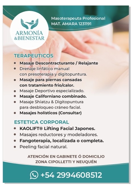 Profesional certificado AMARA. Masajes descontracturantes, relajantes, masaje con piedras calientes, reflexologia de pies, manos y rostro. Digitopuntura, fango terapia, shiatzu, KAOLIF (lifting facial japonés), masajes holísticos.