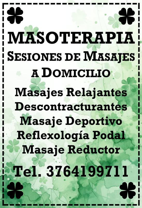 💆Masajes a Domicilio💆 ◽Brindo sesiones de Masoterapia a Domicilio, Masajes de 1 hora. ◽Se trabaja con Turno. ◽Cuerpo completo o adecuado a la zona afectada. ◽Con uso de Camilla, con crema y/o aceite para masajes. ◽El paciente debe definir un espacio físico adecuado para la sesión, y en caso de cuerpo completo, debe presentarse en un estado de Higiene con ropa cómoda, no desnudez. MASAJES: ▪️Masaje relajante y/o Descontracturante → 12000$ ▪️ Sesión de Reflexología → 8000$ ▪️Masaje Deportivo → 14000$ ▪️Masaje Reductor → Precio a definir con el Paciente